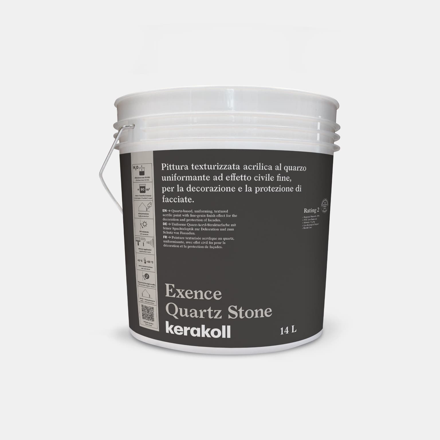 Pittura texturizzata acrilica al quarzo uniformante a effetto civile fine, per la decorazione e la protezione di facciate. Exence Quartz Stone è caratterizzata da inerti a base quarzo, che esaltano il suo effetto materico stonalizzato, regolarizzano le imperfezioni e uniformano il fondo, migliorandone la resa estetica. A elevata copertura, è indicata per il riempimento di microcavillature stabilizzate. Garantisce, inoltre, ottima resistenza agli agenti atmosferici.