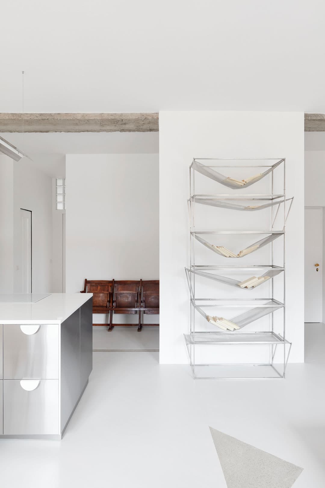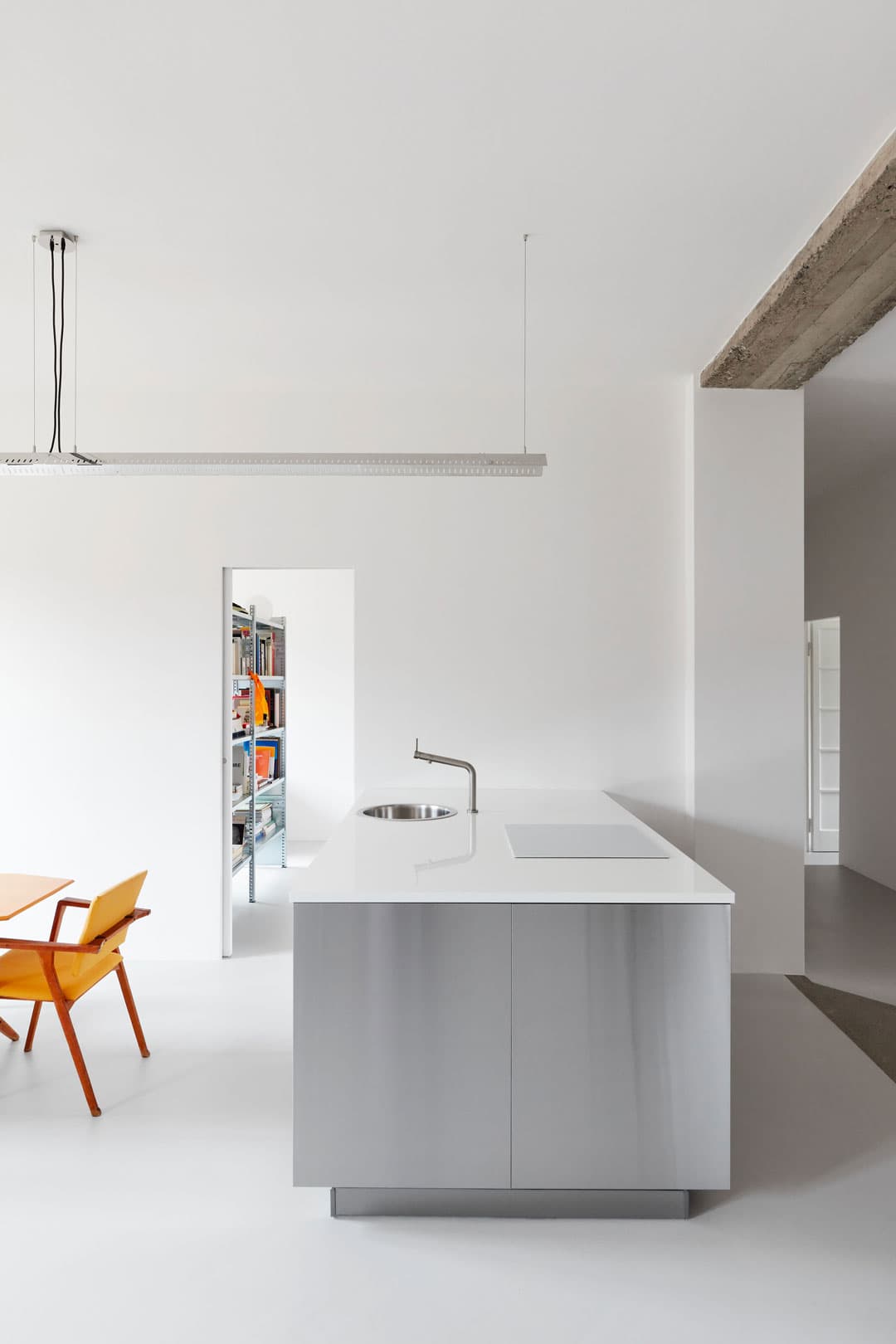 La cucina diventa protagonista grazie a un’isola in acciaio inossidabile, elemento di forte impatto visivo che richiama il trend delle superfici specchiate, eleganti e contemporanee. Posizionata al centro dell’abitazione, definisce e connette gli ambienti, coniugando funzionalità e stile. Il corridoio, elemento architettonico di collegamento, guida lo sguardo e amplia la percezione dello spazio.
